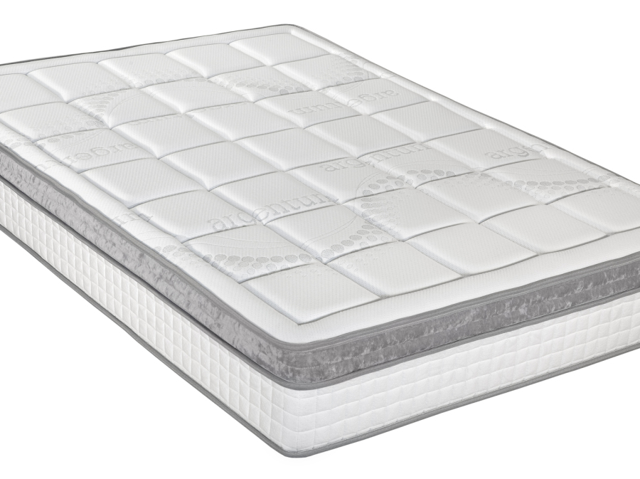> Tejido en Damasco, texturado con fibras naturales de total traspiración, que evita la sudoración durante el descanso y con tratamientos sanitarios que anulan la proliferación de bacterias y ácaros.